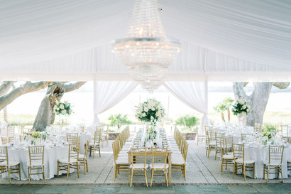 One of our favorite aspects of wedding planning is the versatility! This Lowndes Grove wedding took a more glamorous route with all white decor and elegant touches. Lush floral arrangements lined the main table while glimmering Empire Chandeliers were suspended above the tablescape to draw guests’ eyes. No detail was overlooked with this wedding reception - even the outdoor lounge had a matching Empire Chandelier luxuriously floating above the space.